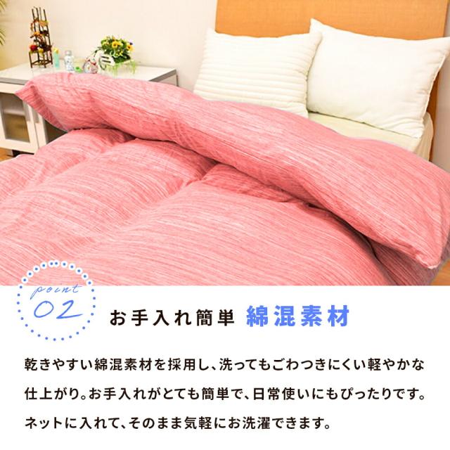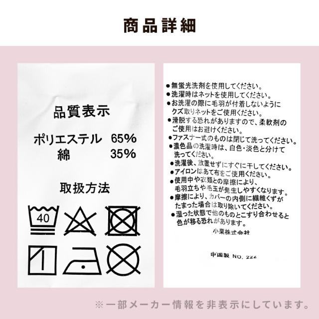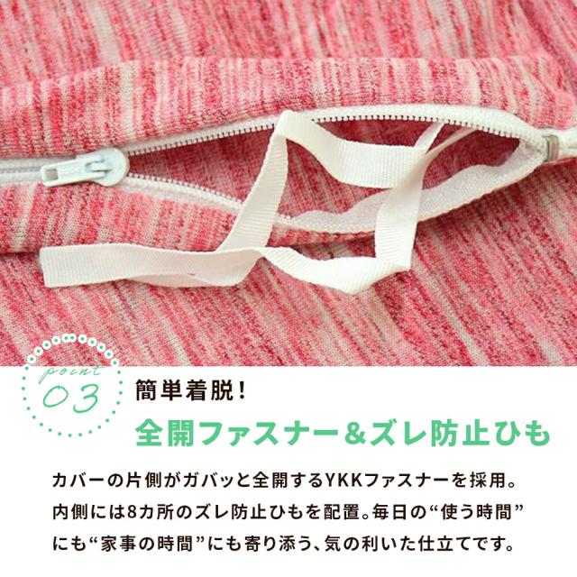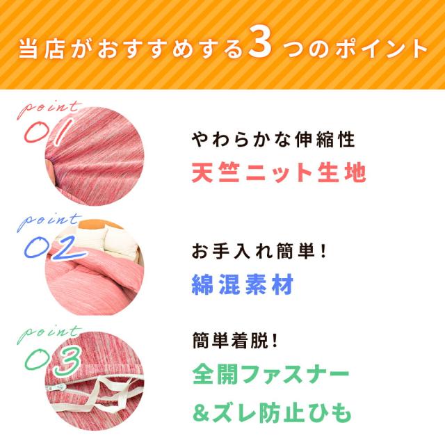 ・やわらかな“天竺ニット”生地 Tシャツのようにやわらかく伸びて、肌にそっと寄り添う天竺ニット素材。繊細な杢柄がほどよいニュアンスを添え、無地感覚でどんな寝室にもすんなりなじむ上品な仕上がりです。 ・お手入れ簡単 綿混素材乾きやすい綿混素材を採用し、洗ってもごわつきにくい軽やかな仕上がり。お手入れがとても簡単で、日常使いにもぴったりです。ネットに入れて、そのまま気軽にお洗濯できます。 ・簡単着脱!全開ファスナー&ズレ防止ひもカバーの片側がガバッと全開するYKKファスナーを採用。内側には8カ所のズレ防止ひもを配置。毎日の“使う時間”にも“家事の時間”にも寄り添う、気の利いた仕立てです。 |