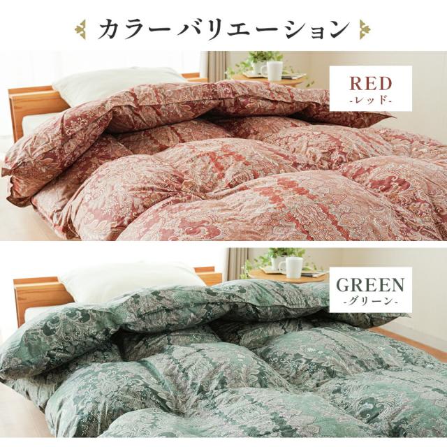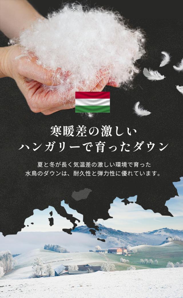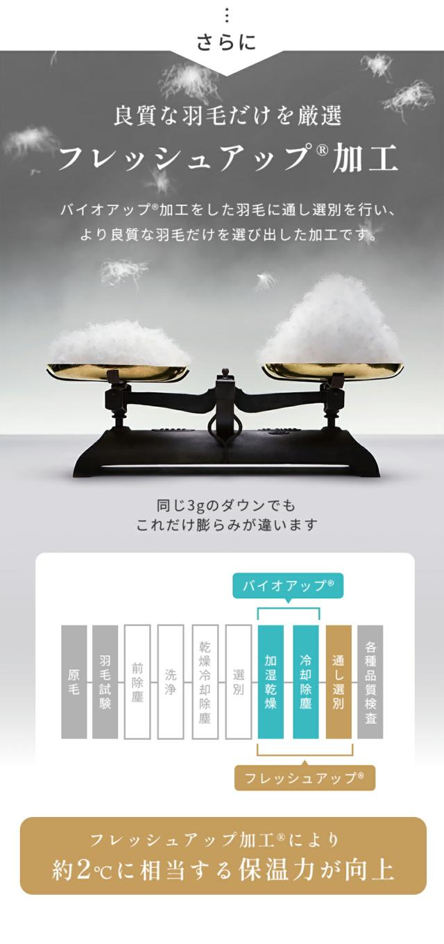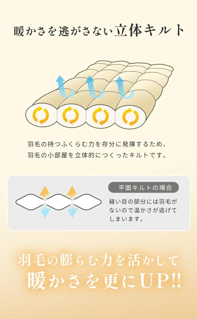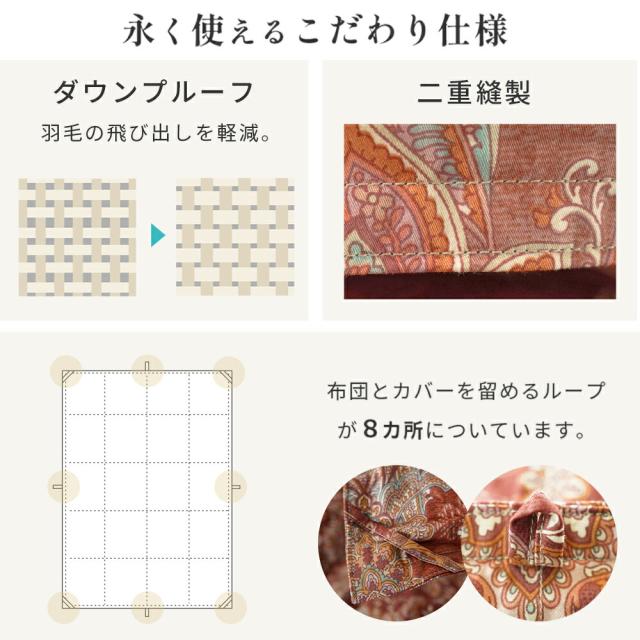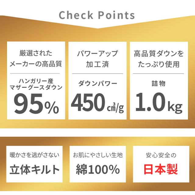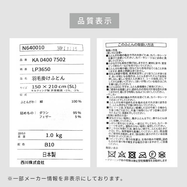・創業450年以上の信頼と歴史 西川は創業450年以上の長い歴史を持ち、長年培ってきた確かな技術と信頼により、多くの顧客に選ばれています。 ・マザーグースダウン95%の贅沢配合厳選されたダウンを95%使用。芯がなくふわふわのダウンが多くの空気を含み、軽くて保温性・吸放湿性に優れています。 ・高品質を示すダウンパワー450dp羽毛1gあたりの膨らみ度合いを示すダウンパワーは450dp。より暖かく快適な羽毛布団を求める方に最適です。 ・寒暖差の激しいハンガリー産ダウン使用夏と冬の気温差が大きい環境で育った水鳥のダウンは、耐久性と弾力性に優れています。 ・安心の羽毛トレーサビリティ認証正規ルートで輸出入された羽毛を使用し、産地偽装のない原料であることを証明するJ-TAS認証を取得しています。 ・業界基準の2倍の清浄度で清潔西川独自の洗浄技術により、羽毛の清浄度は業界基準の2倍(1000mm)。よりクリーンで安全な羽毛です。 ・バイオアップ(R)加工でほこりを軽減100℃以上のスチームで羽毛を開かせ、冷却で不純物を除去。加工前より約26%ほこりを減らす効果が実証されています。 ・フレッシュアップ(R)加工で保温力向上バイオアップ(R)加工を経た羽毛からさらに良質な羽毛だけを選別。従来より約2℃に相当する保温性の向上が確認されています。 ・暖かさを逃さない立体キルト構造羽毛のふくらむ力を活かし、立体的な小部屋に分けた構造で、保温性をさらにアップ。温かさをしっかりキープします。 ・国内パワーアップ加工でふっくら復元圧縮された羽毛を専用の機械で加熱・殺菌し、ふっくらとした本来の状態に復元。清潔で安心な羽毛に仕上げます。 ・60サテン綿100%生地でやさしい肌触り側生地には吸湿性に優れた綿100%の60サテンを使用。お肌にやさしく、なめらかな手触りです。 |