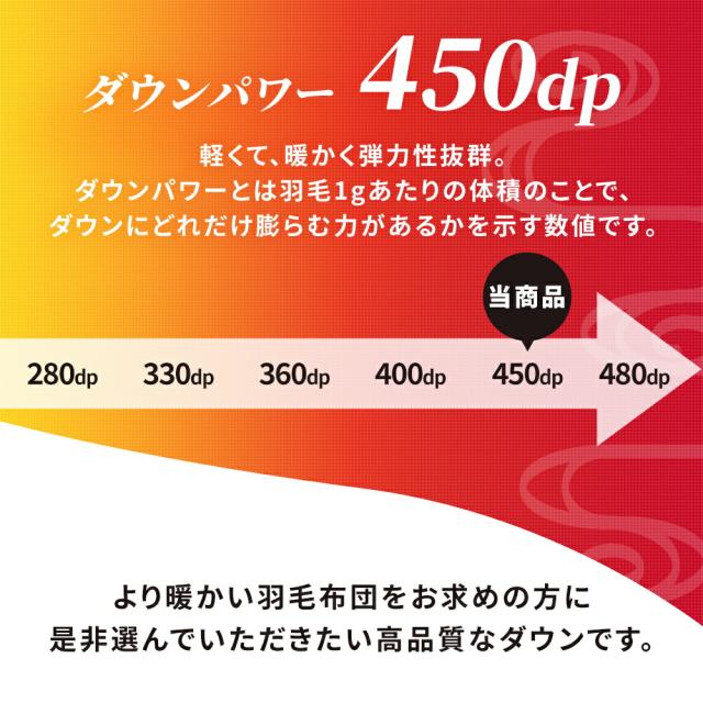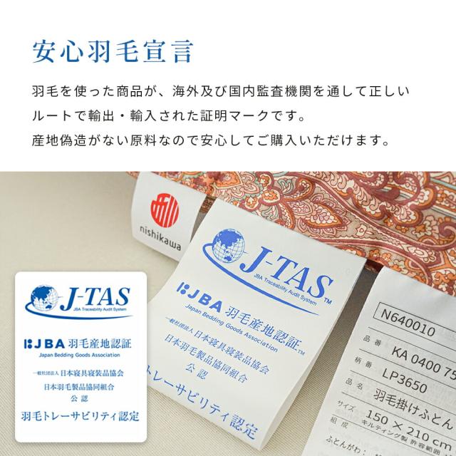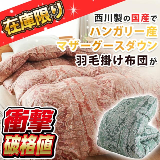 [keyword | 羽毛布団 マザーグースダウン95% ダウンパワー450dp ハンガリー産ダウン J-TAS認証 トレーサビリティ 西川ブランド 清浄度1000mm バイオアップ加工 フレッシュアップ加工 立体キルト 保温力アップ 綿100%サテン生地 日本製 吸湿性 軽量 暖かい布団 ホコリ軽減 高品質羽毛 安心安全素材]