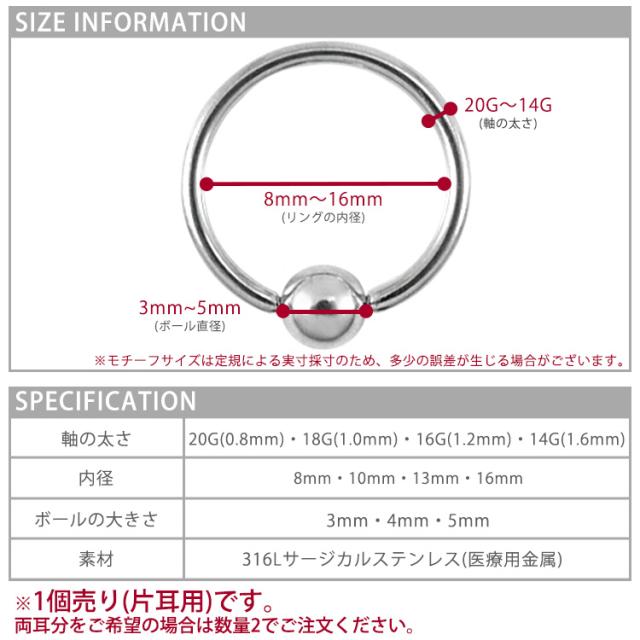 500円ポッキリ 金属アレルギー対応 ステンレス製 ボディピアス [カスタム] キャプティブビーズリング 華奢 20G 18G 16G 14G サージカルステンレス製 フープピアス 軟骨