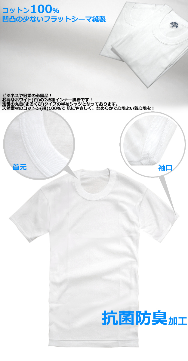 [素材]COTTON(綿)100%[サイズ]M(胸囲88-96 身長165-175)L(胸囲96-104 身長175-185)LL(胸囲104-112 身長175-185)[カラー]ホワイト(白)[生産国]中国/ベトナム/インドネシア[特徴]・丸首半袖タイプ・フライス編み(凹凸の少ないフラットシーマ縫製)[商品詳細]ビジネスや冠婚の必需品。お得なホワイト(白)の2枚組インナー肌着です。定番の丸首タイプの半袖シャツとなっております。天然素材のコットン(綿)100%で肌にやさしく、なめらかで心地よい着心地を。M/L/LLから選べます。男のアンダーウェア♪オールシーズン活躍間違い無し。[ご注意]当店ではラッピング等は一切承っておりません。・製品の使用回数、洗濯回数が少ない内は 色移りの可能性が御座います。 白、または色移りのしやすい物との併用、洗濯はお避けください。・商品画像はできるだけ実際のカラーに近づけておりますが、 お客様がお使いのモニターによりましては、 多少色具合が異なって見える場合もございます。 予めご了承ください。[用途]肌着 インナー シャツ トップス綿 コットン cotton 作業着 普段着 無地 シンプルメンズ 紳士 男性 男の子 mens M L LL