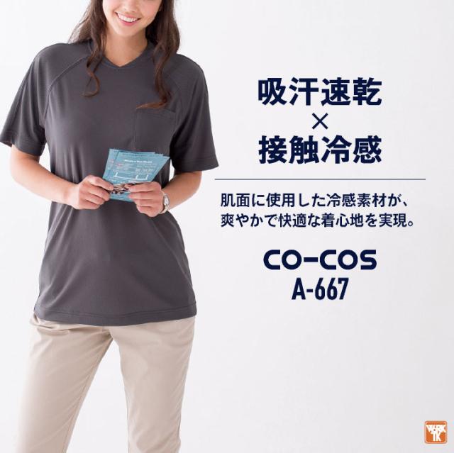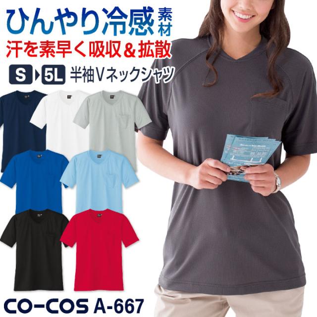 コーコス 接触冷感 吸汗速乾 Vネック Tシャツ 半袖 ドライ 涼しい ひんやり 暑さ対策 無地 シンプル 春夏 作業服 作業着 スポーツ ヨガ ジム アウトドア メンズ レディース ネイビー ホワイト グレー ブルー ブラック レッド 紺 白 青 黒 赤 CO-COS cc-a667