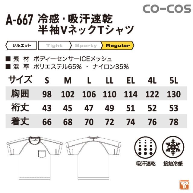 A-667 CO-COS 冷感・吸汗速乾 半袖VネックTシャツ 肌面に使用した冷感素材が、爽やかで快適な着心地を実現。