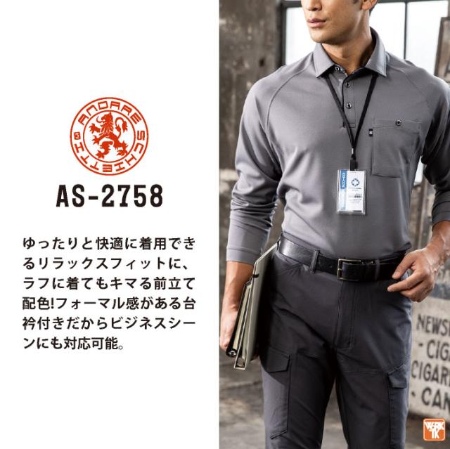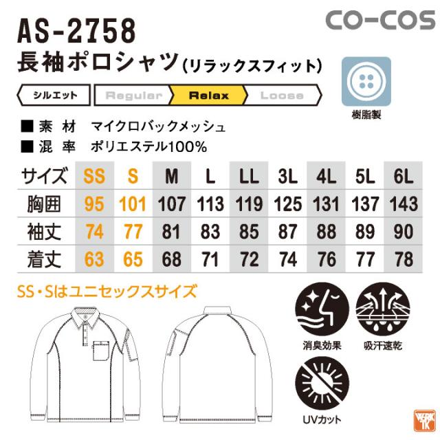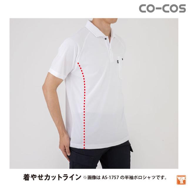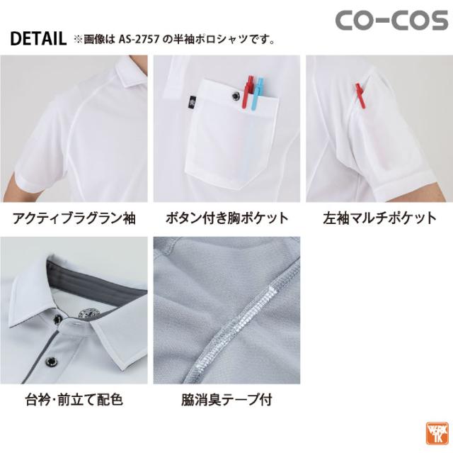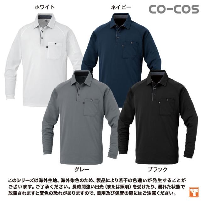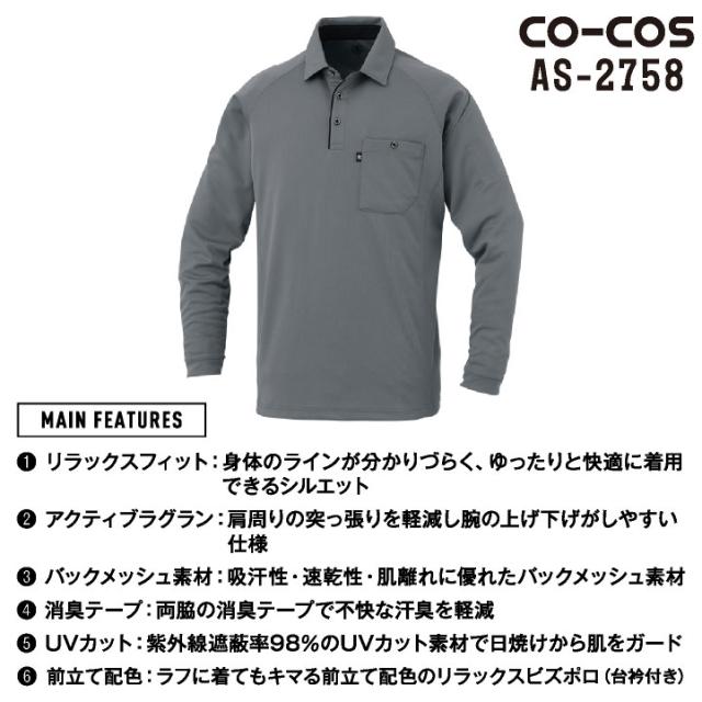 コーコス 長袖 ポロシャツ ドライ 吸汗速乾 UVカット メッシュ 消臭 涼しい 春夏 作業服 作業着 オフィス ビジネス クールビズ 通勤 制服 ユニフォーム スポーツ ゴルフ 無地 シンプル 白 黒 ネイビー メンズ レディース CO-COS cc-as2758