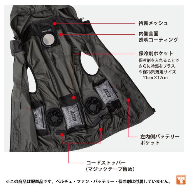 背中と両脇の3箇所に保冷剤ポケットを搭載し、さらなる冷却効果を発揮します。
