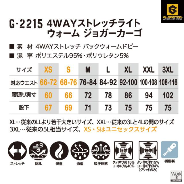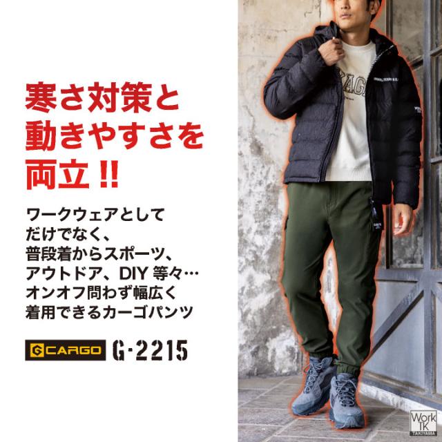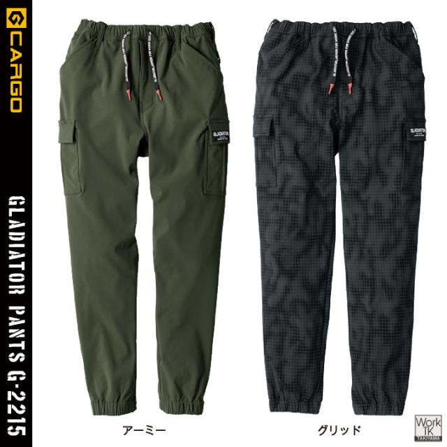 GLADIATOR G-2215 大人気「G-CARGO LIGHT」シリーズに、防風・透湿・保温性をプラスした秋冬モデルのストレッチジョガーカーゴ。 ジョガータイプで足元スッキリ。