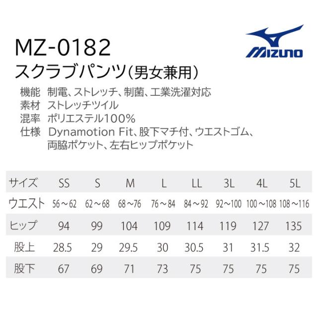 MZ-0182 ミズノ スクラブパンツ 兼用 ソフトな履き心地 軽やか素材の ストレッチ ツイル 軽い動きやすい 名入れ 刺しゅうも可能。医療 整骨院 介護 リハビリ チームスクラブ SSから5L