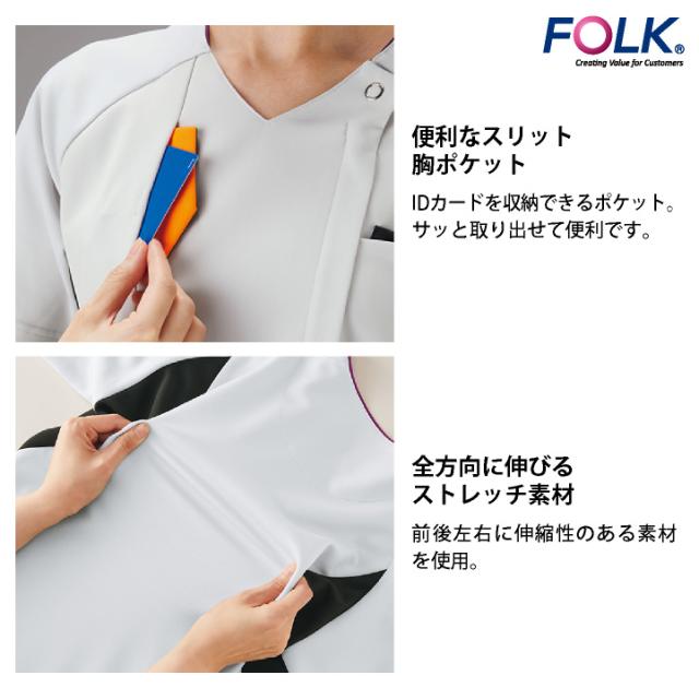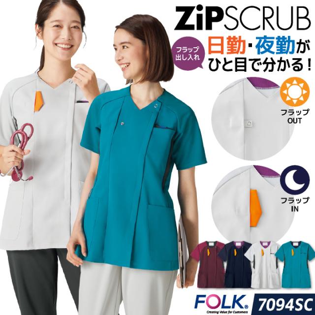 7094SC FOLK レディスジップスクラブ 袖と背面に伸縮性の高いニット素材。 胸の蛍光フラップは、出す・入れるの着方で日勤夜勤の勤務を識別してくれる役割で便利。