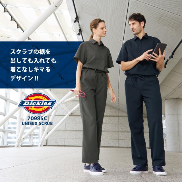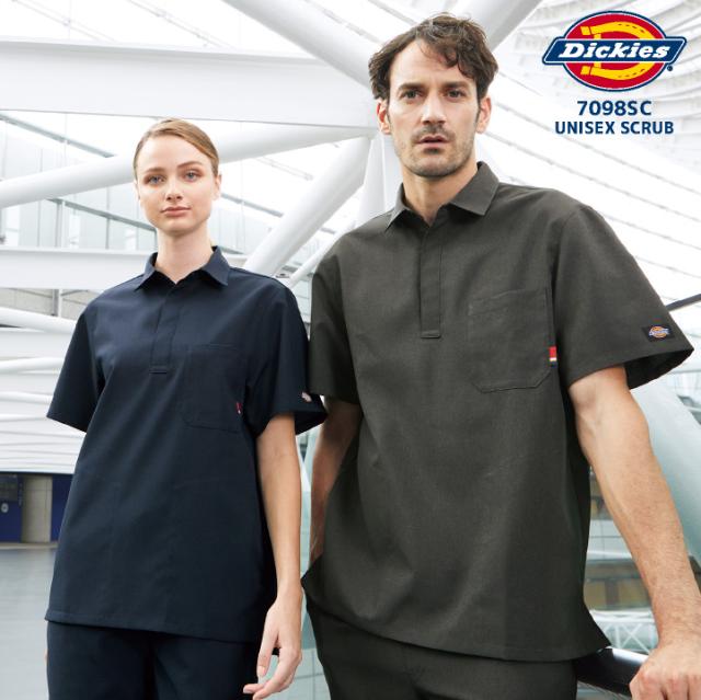 Dickiesのワークシャツをイメージした、シャツ衿タイプの男女兼用スクラブ。