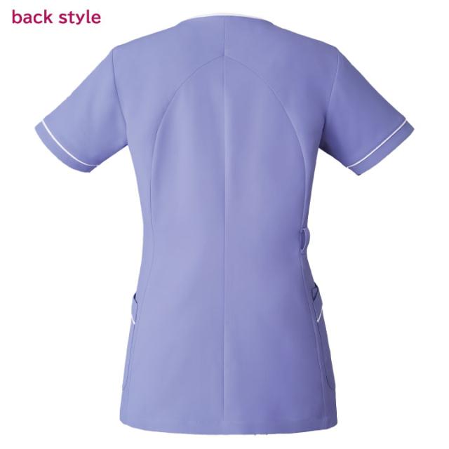 顔まわりに白いアクセントを効かせ、顔まわりを明るく演出するジップタイプのスクラブは、清楚で華のあるデザインに仕上がりました。