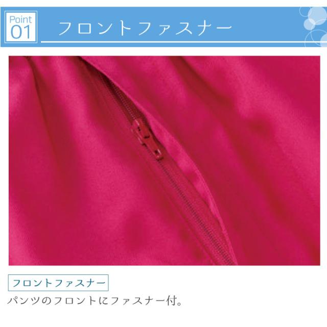 ウエスト総ゴム+内側ひも付きで、調節が可能です。