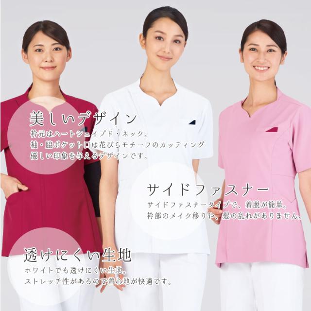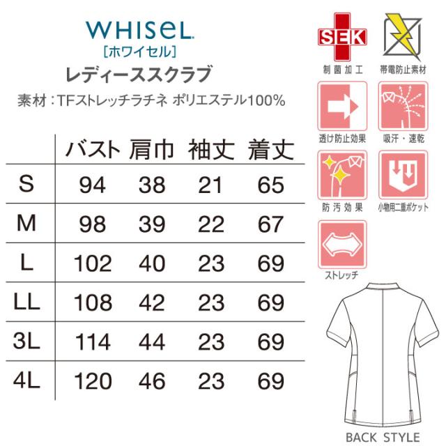 レディーススクラブ ホワイセル サイドファスナー 半袖 おしゃれ 白衣 看護師服 ナース服 女性 防汚 透け防止 自重堂 スクラブ WHISEL jd-wh12095