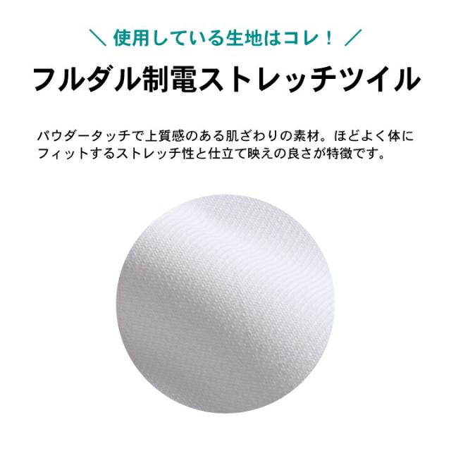 スタンドカラーでスタイリッシュに。 シワになりにくいフルダル制電 ストレッチ ツイル使用。 制菌加工 透け防止 制電 防汚 女性用