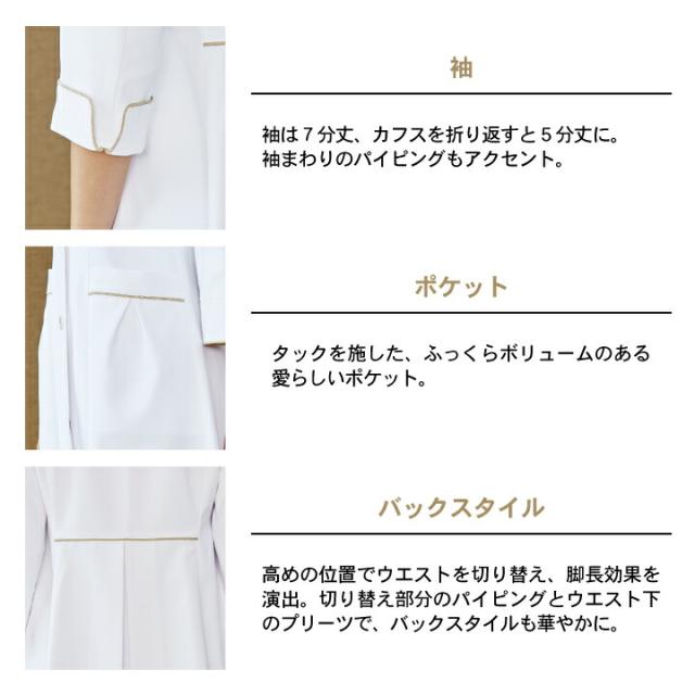 女性医師の理想をカタチにした、心地よく美しいドクターコート。 軽くて ストレッチ 性のある仕立ての良さが魅力的。 制菌加工 透け防止 制電 防汚 女性用