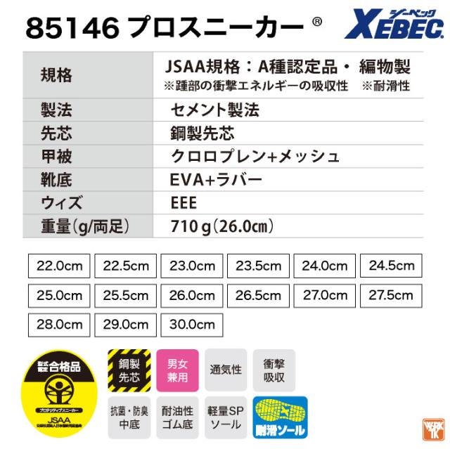 85146 プロスニーカー ジーベック セーフティーシューズ 通気性 男女兼用 衝撃吸収 耐油性ゴム底 スニーカー XEBEC