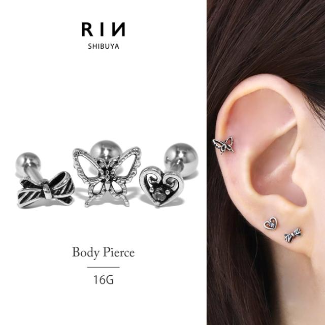 軟骨ピアス アンティークシルバー調 ちいさめ かわいい バタフライ ハート りぼん ストレートバーベル 16G ボディーピアス 軟骨 ピアス ステンレス 16ゲージ 耳 耳たぶ 軟骨用 なんこつ ピアス 片耳用 メンズ 男女兼用 ユニセックス ジェンダーレス アクセサリー おすすめ ポイント消化 body Pierce 凛 ボディピアス専門店 りん 渋谷 軟骨1401