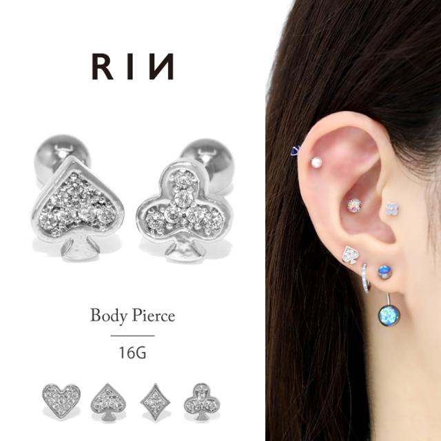 ボディピアス 16G 軟骨 ピアス 片耳用 ハート スペード クローバー ダイヤ ジュエル シルバー トランプ アリス ストレートバーベル 金属 アレルギー 対応 サージカルステンレス 凛