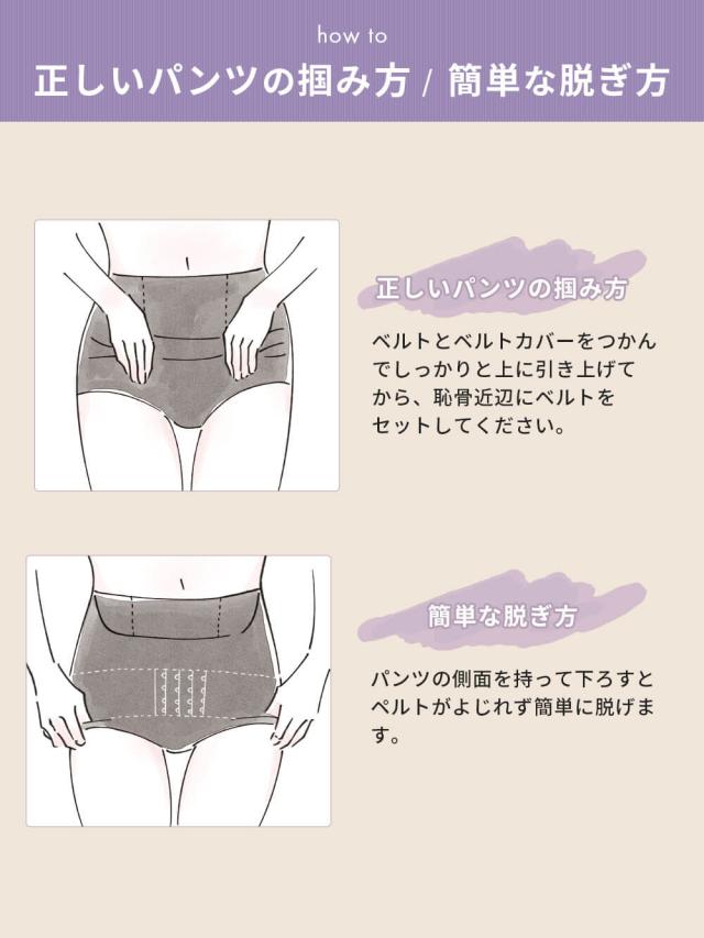「産後すぐから骨盤をしっかりサポートでき、簡単に着用できるものが欲しい」という声に応えて、みやした助産院とエンジェリーベが共同開発。はくだけでちょうどいい位置にベルトがフィットする一体型。お尻を包み込むような立体構造で、骨盤周りをサポートします。動いてもベルトがズレることがなく、締めるべきところを締めて骨盤や腰の負担を軽減。骨盤ベルトをスッポリ覆うベルトカバーで骨盤ベルトがお洋服に引っ掛かることもなく見た目もスッキリ。よく伸びる素材なのでベルトを締めたままトイレでの「脱ぐ」「履く」ができるのも嬉しいポイントです。