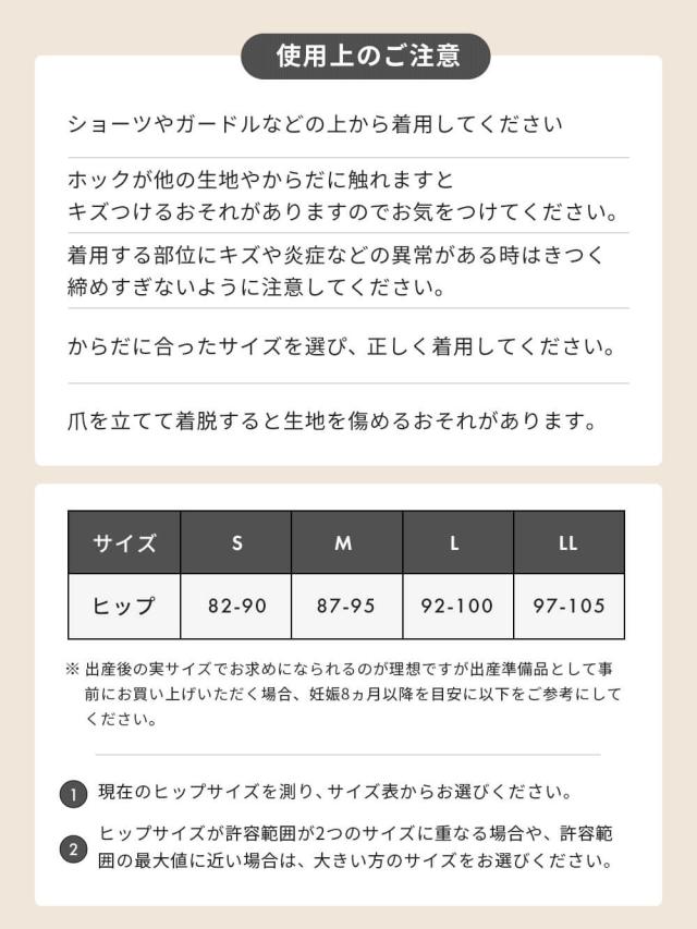 2.ヒップサイズが許容範囲が2つのサイズに重なる場合や、許容範囲の最大値に近い場合は、大きい方のサイズをお選びください。
