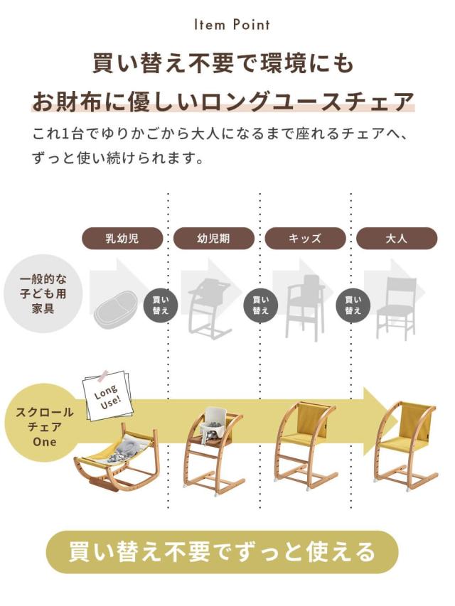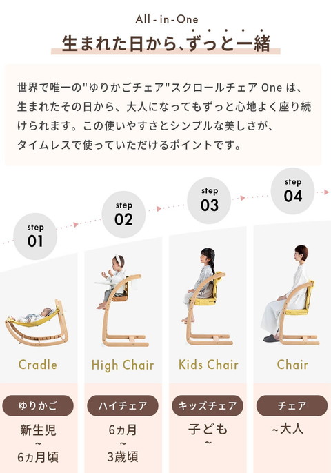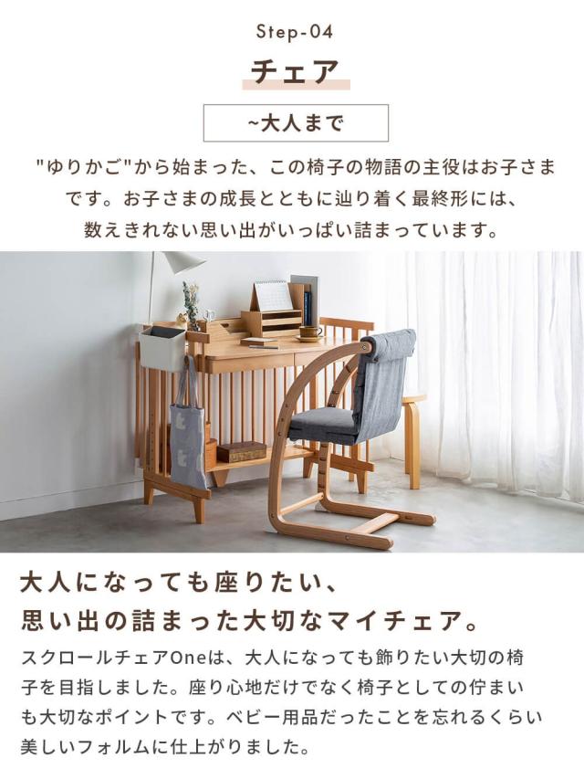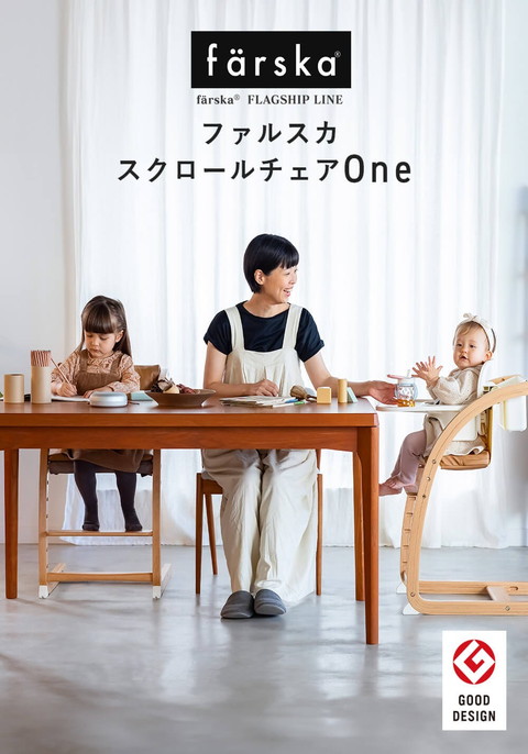 グッドデザイン賞を受賞した「ファルスカ スクロールチェアOne」は、新生児から大人まで成長と共に永く愛用できる買い足し不要のオールインワンセットです。