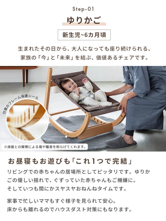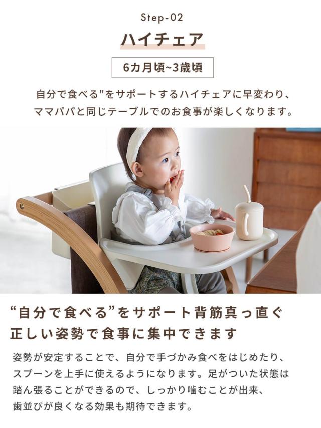 | 対象月齢・耐荷重 | ゆりかご時 新生児から6ヶ月頃(約9kgまで) ハイチェア時 生後6から36ヶ月頃(約15kgまで) チェア時 子どもから大人まで(約90kgまで) |