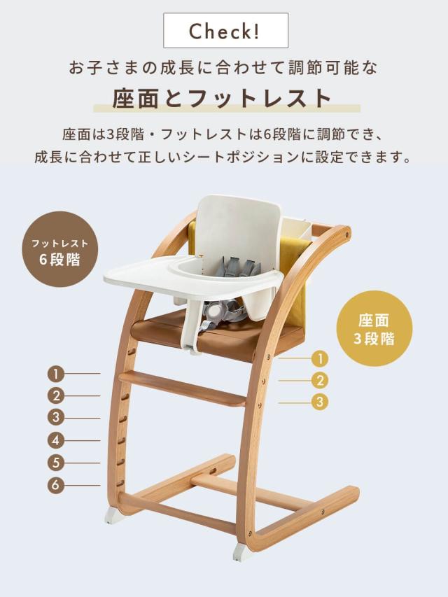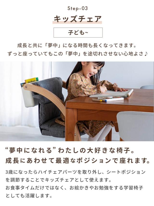 | サイズ | ゆりかご時 約W46×D87×H60cm ハイチェア時 約W46×D57.5×H88cm (テーブルまでの高さ約72cm) キッズチェア・チェア時 約W46×D57.5×H80cm |