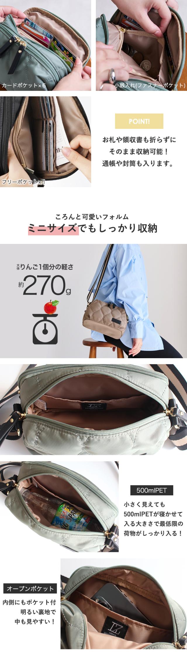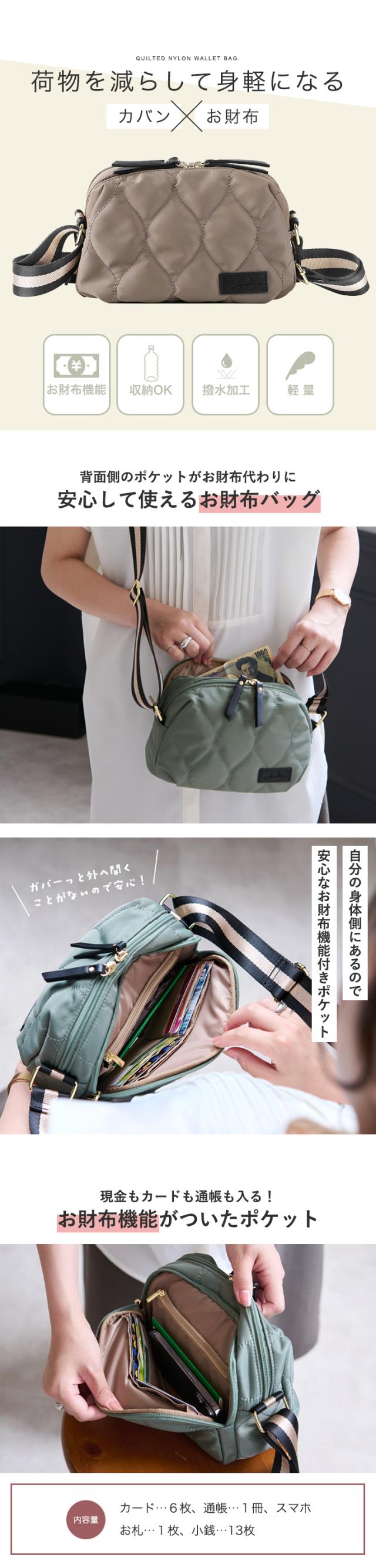 お財布機能がついたポケット付きショルダー。 お財布持たない分、荷物が軽くなって身軽に! 従来のお財布ショルダーとは違い、身体側に開く ポケットなのでまわりの人には中が見られにくく 大きく開いてしまうこともないので安心して使える! カードポケットやファスナー付きポケットで現金も カードも通帳などもまとめて収納可能! お札も折らずにそのまま収納が可能! ママバッグや旅行のサブバッグとしてすぐ 取り出したいものだけ持ち歩くのにちょうどいい 軽量でコンパクトなサイズ感がポイント! 少し丸みのあるフォルムとキルティングのデザインが 大人っぽく上品な雰囲気に。撥水ナイロンなので 雨の日も気兼ねなく使える。 |
