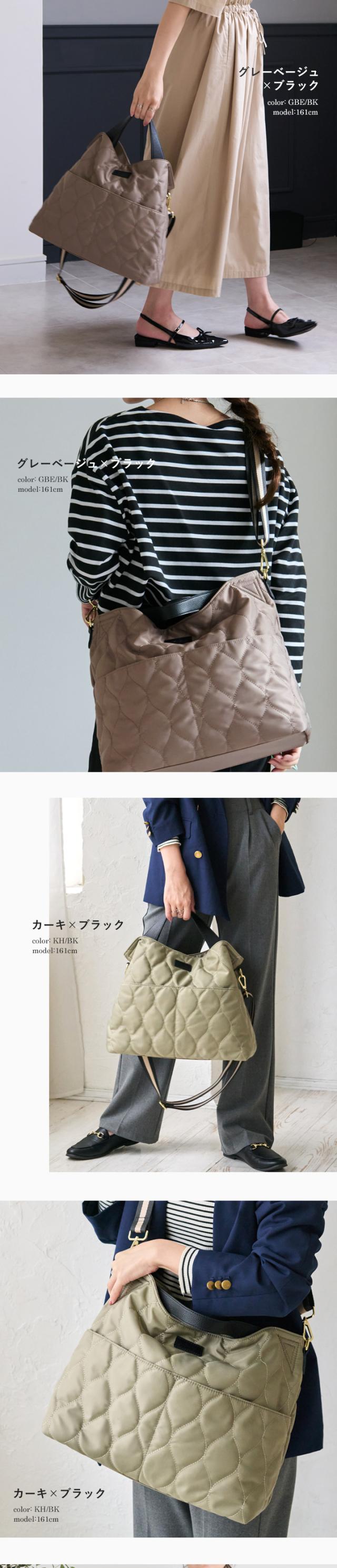 くったりフォルムの上品トートからA4対応の大きめサイズが新登場! お洒落なキルティングデザインはそのままで、荷物をたくさん持ち歩く方にもぴったりな使い勝手抜群のきれいめ大人トート! 底板にICカード入れがあるので、バッグの底面をタッチするだけでスムーズに改札を通過できます◎ 500mlPETがすっぽり収まるボトルポケットを含む計9つのポケット付きで小物収納にも困りません。 ふっくらキルティングがおしゃれな高密度ナイロン生地を使用しており、撥水加工が施されているので雨の日も安心です! 上品な光沢感のあるショルダーベルトと部分使いされたPUレザーで高見えするデザインに。 普段のお出かけはもちろん、通勤通学にも使いやすく、年代問わず幅広くご愛用いただけます。 |