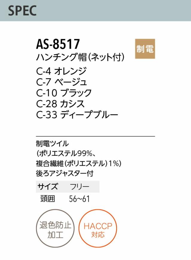 ハンチング帽 AS-8517 帽子 ネット付き 制電 カフェ 飲食店 サービス業 制服 レストラン 厨房 レディース メンズ 男女兼用 ユニフォーム チトセ arbe アルベ【送料無料】
