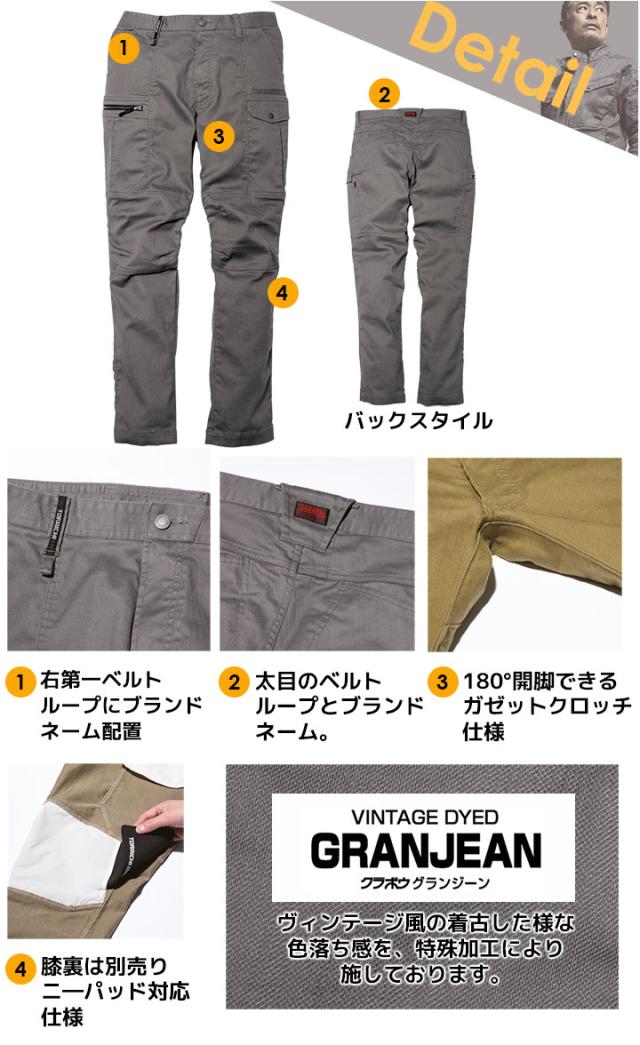 ・国産生地「GRANJEAN」を使用し、ポリウレタン無しでストレッチ性を持ちユーズド感が楽しめる商品。