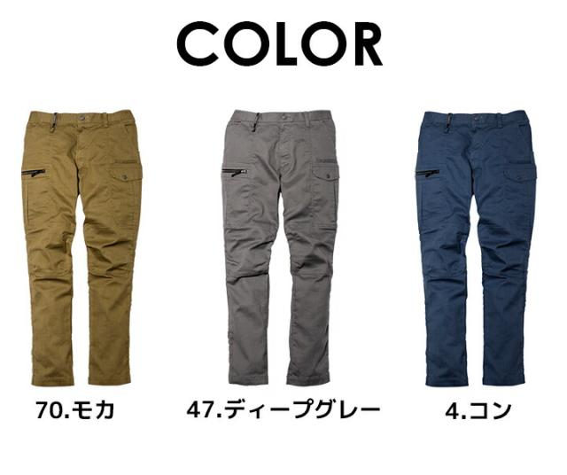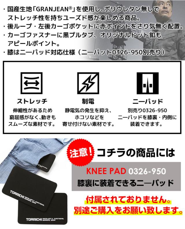 ・カーゴファスナーに黒プルタブ、オリジナルドット釦もアピールポイント。・膝はニーパッド対応仕様(ニーパッド 0326-950 別売り)