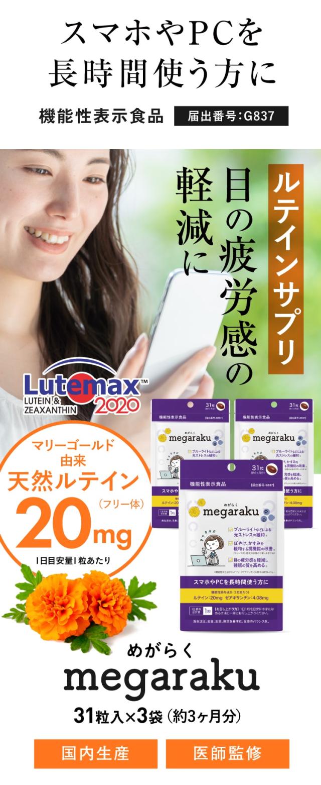 ルテインサプリメント ルテイン ゼアキサンチン 濃淡を識別 ぼやけ かすみを緩和する 黄斑色素量を増加 維持 眼の疲労感軽減 目のサプリメント 目の疲れ ブルーベリー ビルベリー DHA EPA アスタキサンチン 医師監修 機能性表示食品 めがらく 31粒 3個セット メール便