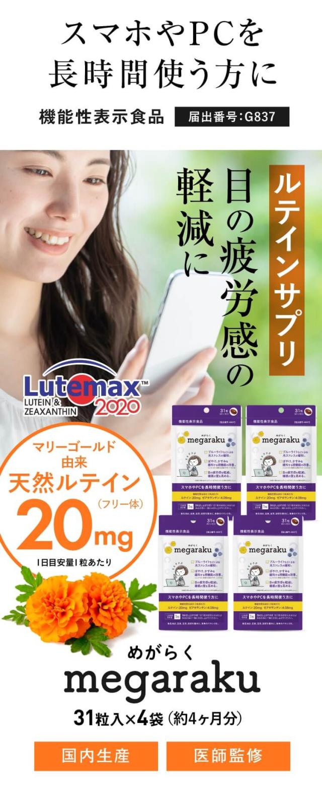 「めがらく」はスマホなどの画面を長時間見る方、もやっと感が気になる方におすすめの食品です。主成分として、1カプセルあたりマリーゴールド由来のルテインを20mg、ゼアキサンチンを4.08mg、贅沢に配合いたしました。