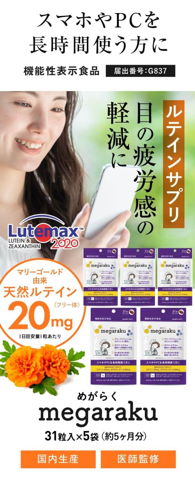 「めがらく」はスマホなどの画面を長時間見る方、もやっと感が気になる方におすすめの食品です。主成分として、1カプセルあたりマリーゴールド由来のルテインを20mg、ゼアキサンチンを4.08mg、贅沢に配合いたしました。
