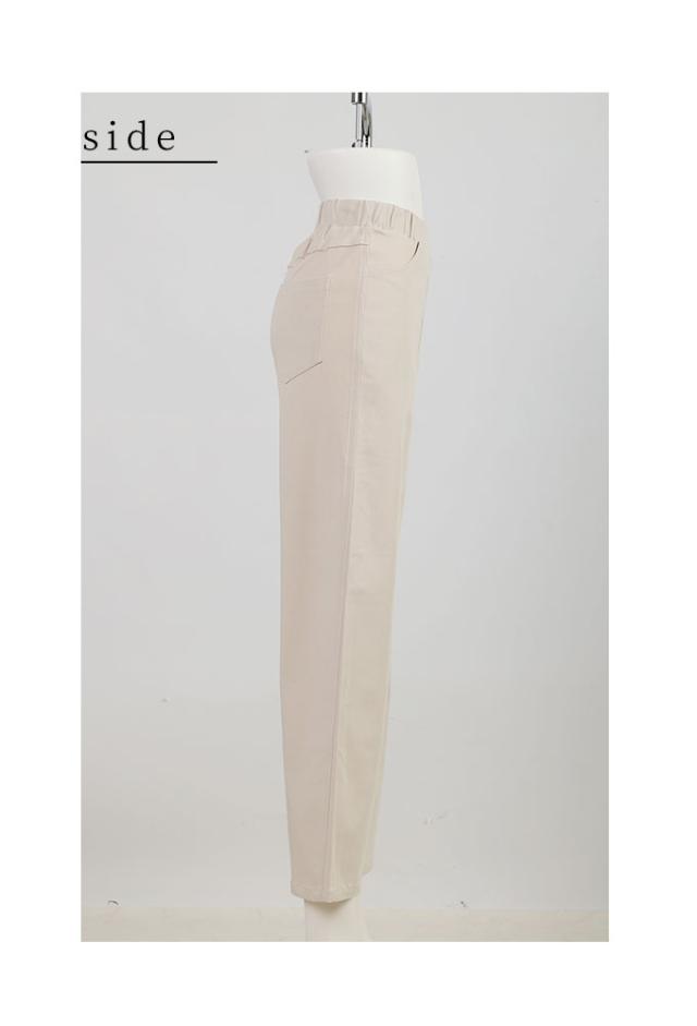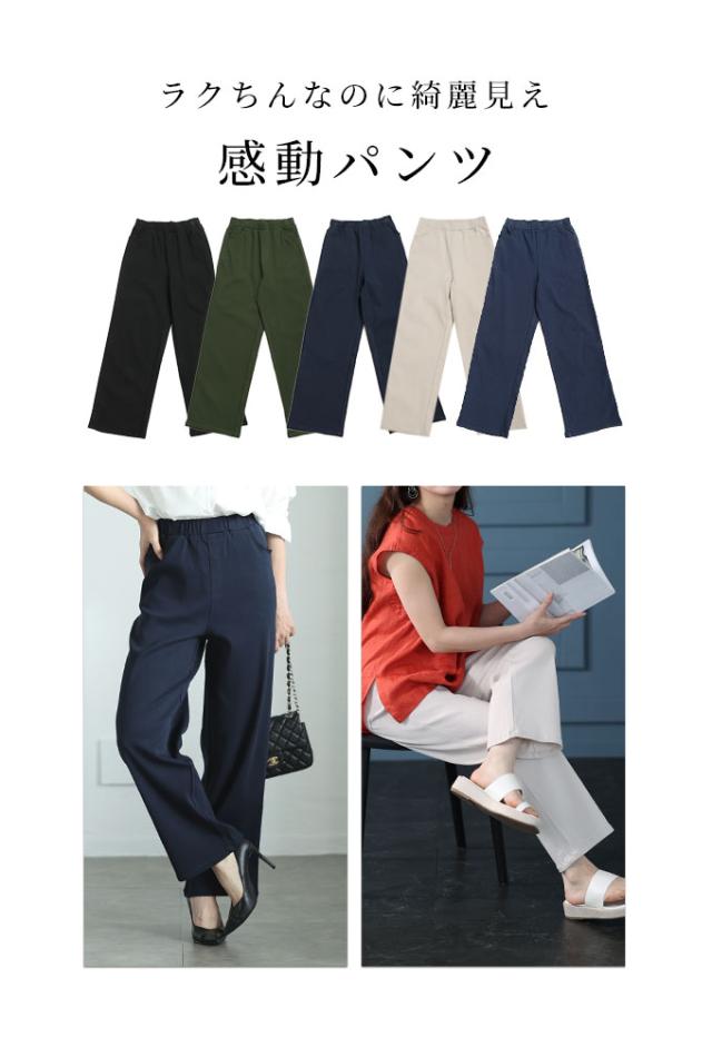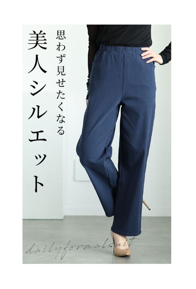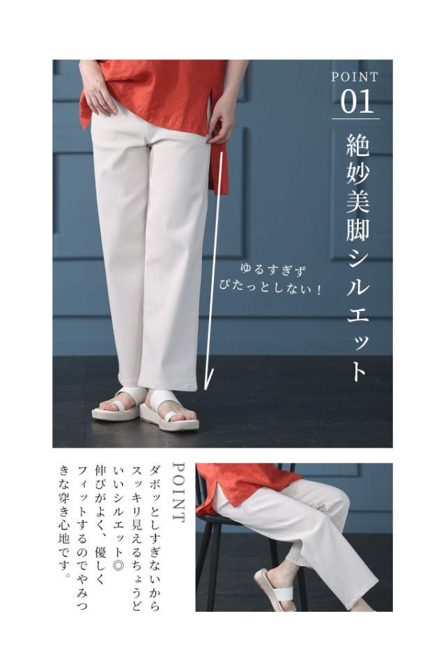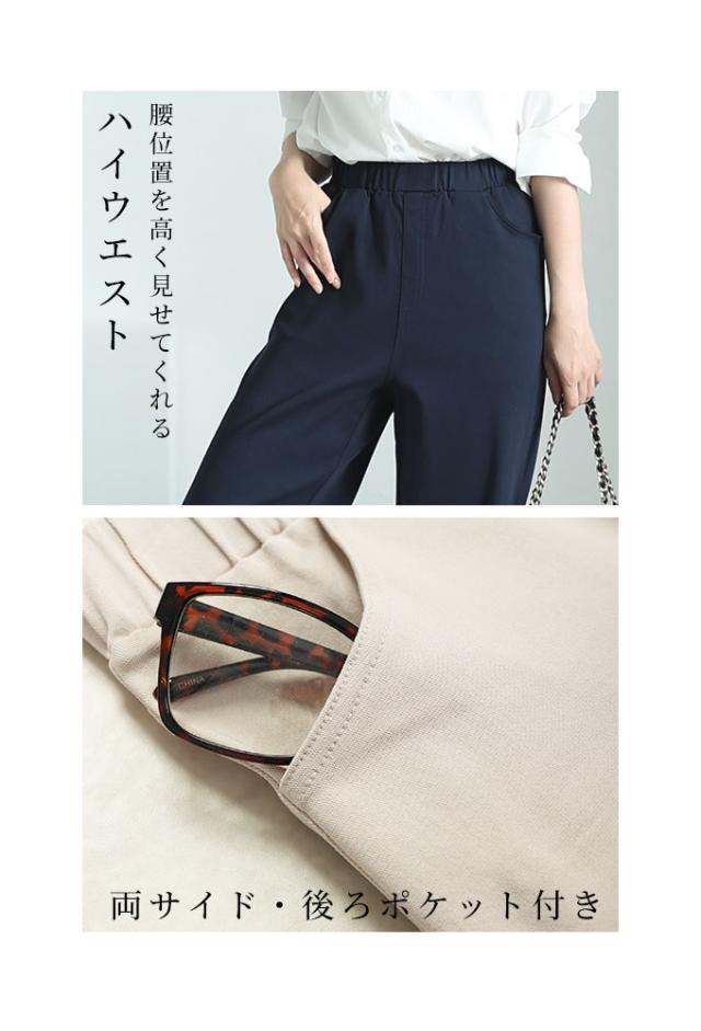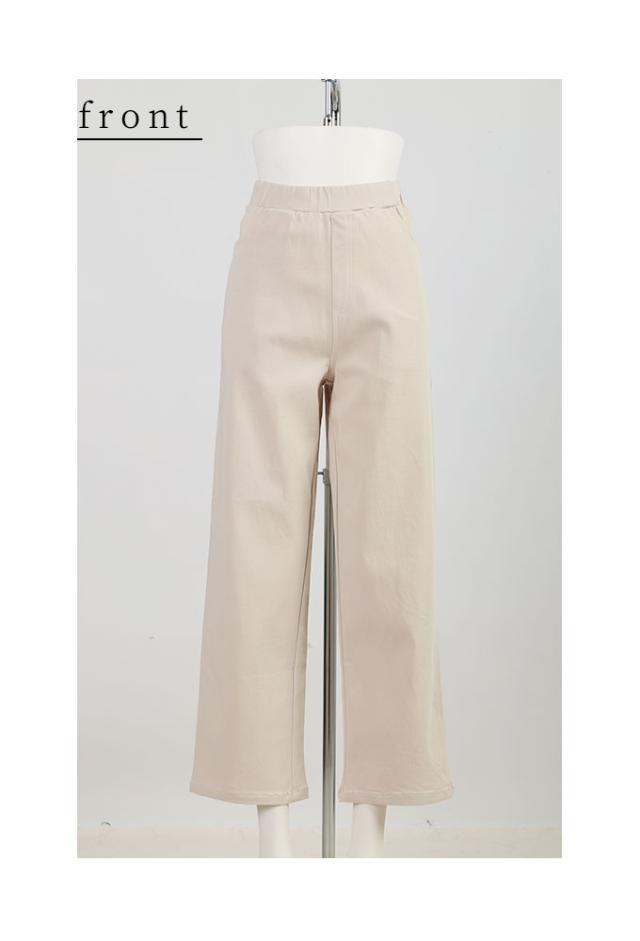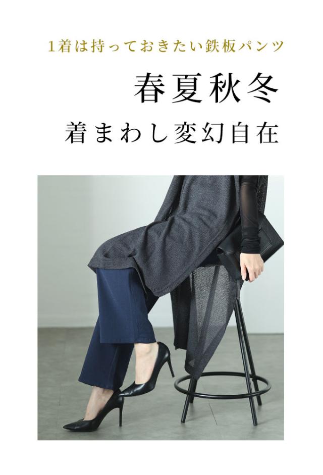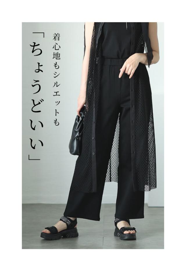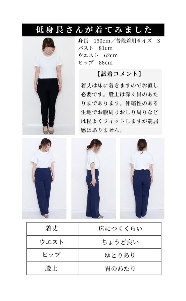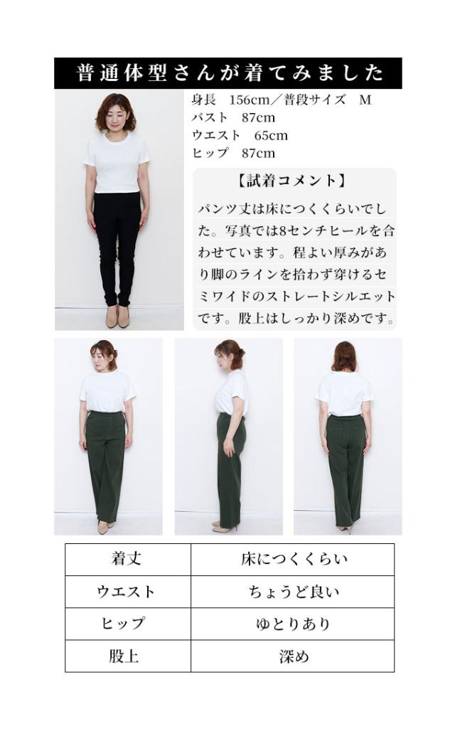 パンツ丈は床につくくらいでした。写真では8センチヒールを合わせています。程よい厚みがあり、脚のラインを拾わず穿けるセミワイドのストレートシルエットです。伸縮性があるのでしゃがんでも楽でした。股上はしっかり深めで安定感がありました。ウエストは総ゴム入り、ファスナーのないプルオンタイプで楽に着脱できました。前後に2つずつポケット付きです。