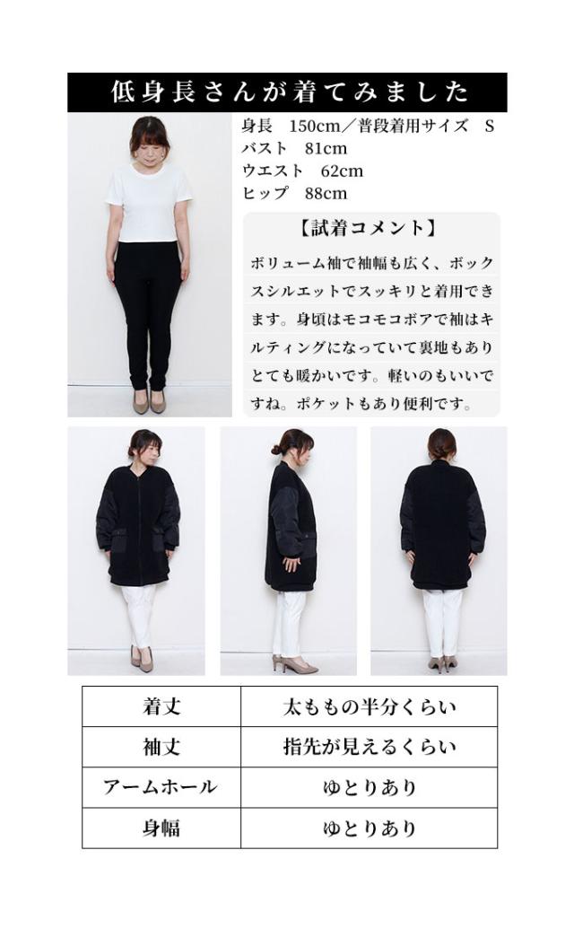 着丈は太ももが半分隠れるくらいです。袖は伸ばすと指先が見えるくらいです。ボリューム袖で袖幅も広いです。ドロップショルダーで脇グリも身幅も余裕がありました。ボックスシルエットでスッキリと着用できます。身頃はモコモコボアで袖はキルティングになっていて裏地もありとても暖かいです。軽いのもいいですね。ポケットもあり便利です。