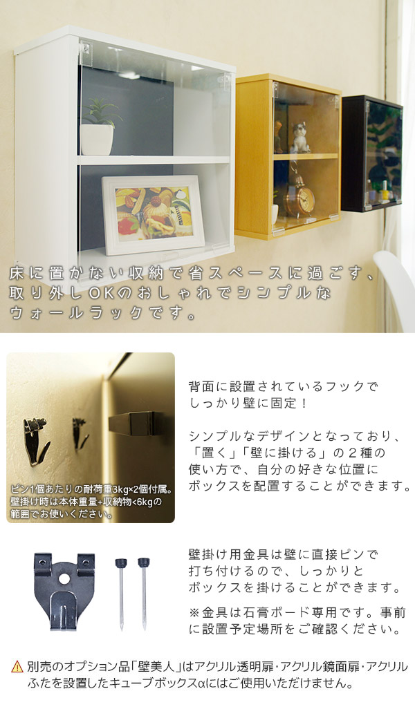 お気に入りを壁に飾る ウォールシェルフ 木棚付き アクリル 透明扉 コレクションケース 壁掛け 棚 木製 おしゃれ フィギュア 棚 フィギュアケース 扉付き 石膏ボード ピン 薄型 キューブボックスα ハーフ