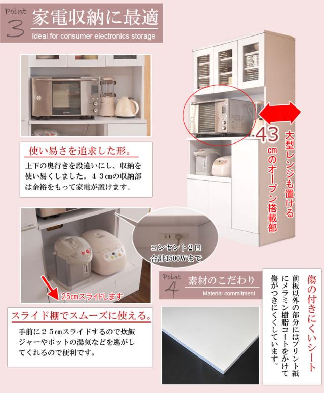 取っ手のないスッキリデザイン カップボード キッチンボード 食器棚 幅90 奥行45 ホワイト 送料無料 シンプル 大型レンジ対応 おしゃれ レンジ台 レンジボード