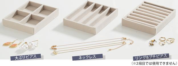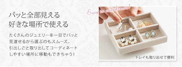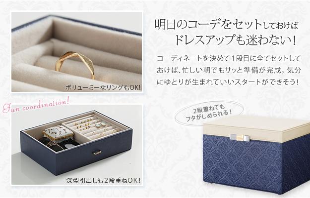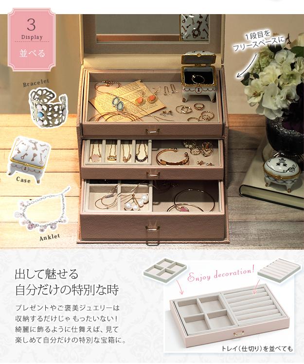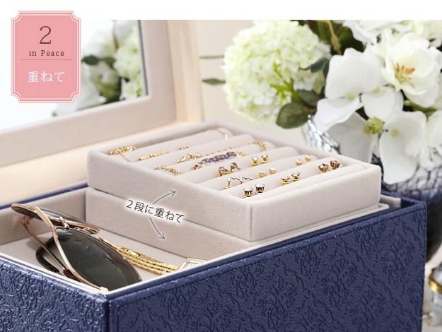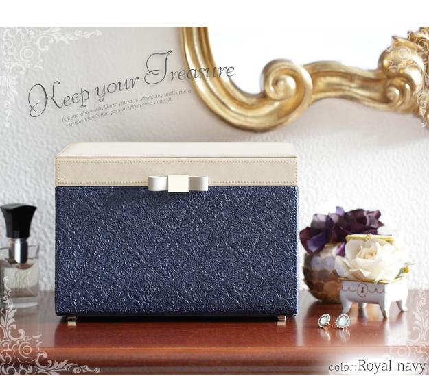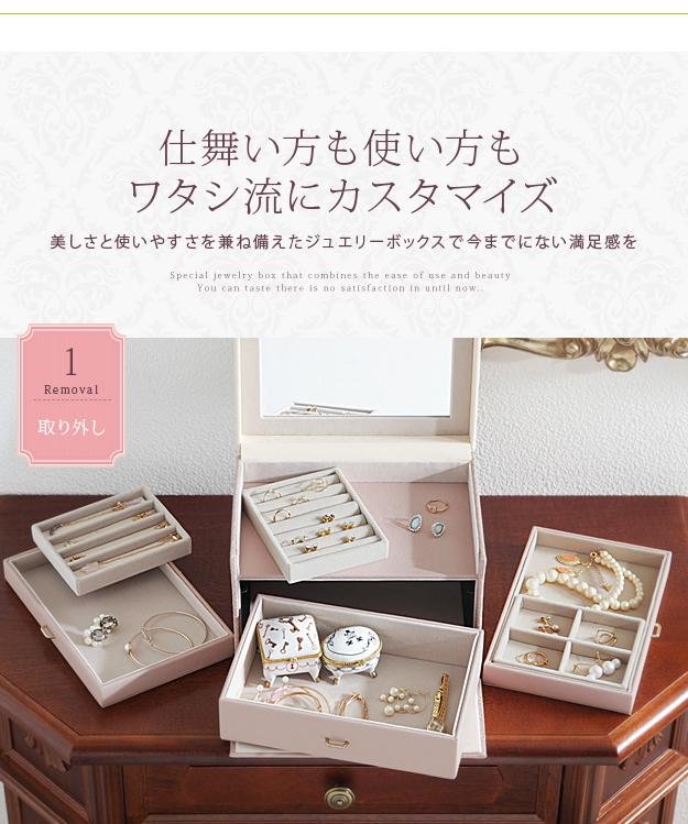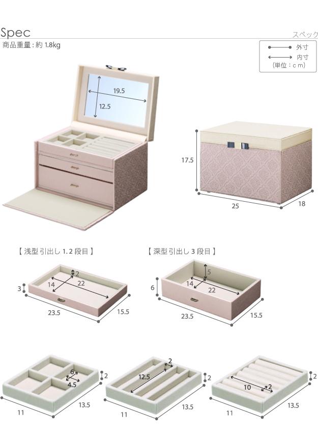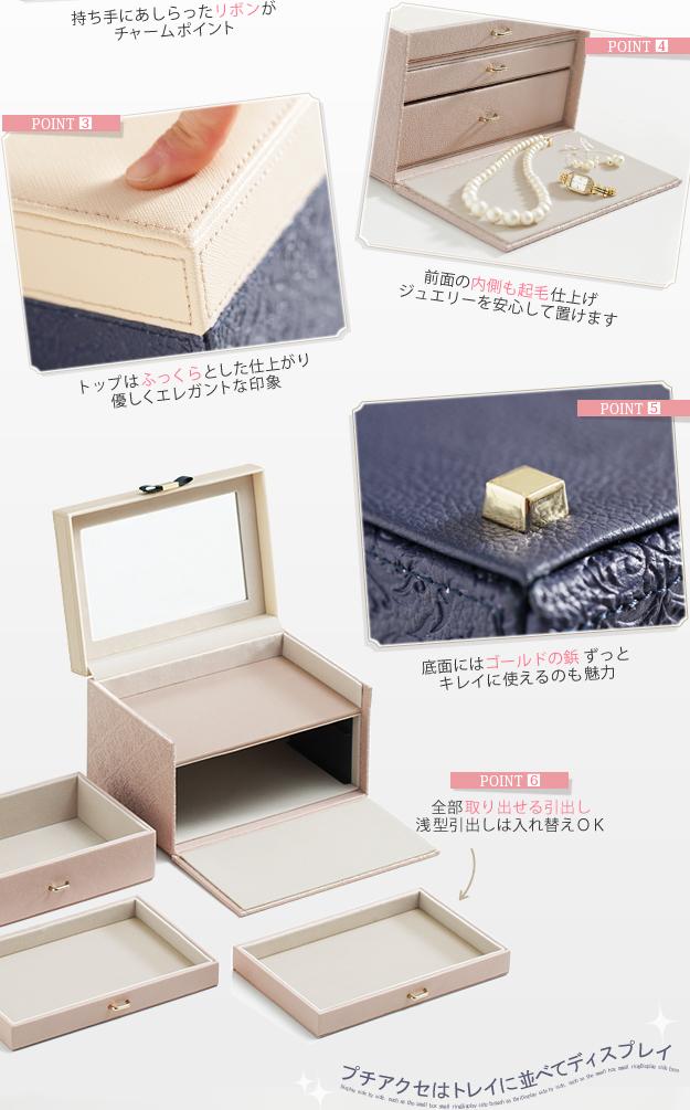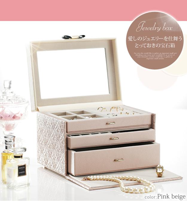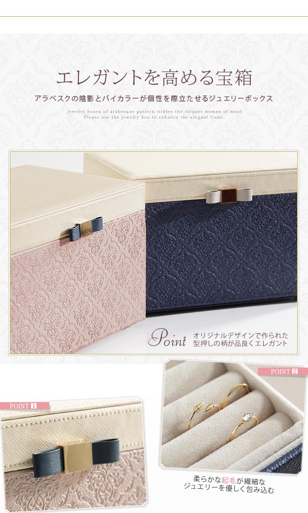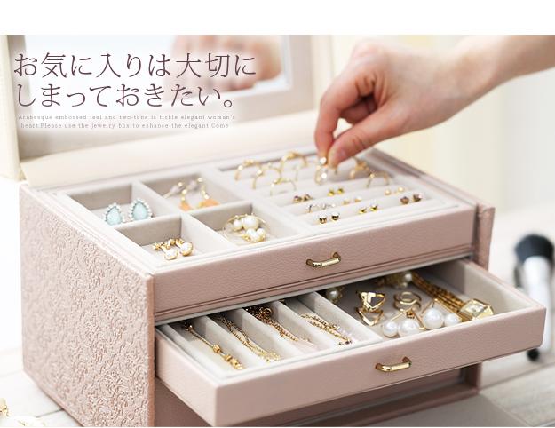 商品について:上質感あるアラベスク柄のジュエリーボックスです。表面の合皮にエンボス加工を施したボックスはシックな雰囲気で大人の女性におすすめ♪引出しは抜いてトレイのように並べてチョイスしやすく、鏡もついているので忙しい朝でもストレスなくコーディネートできるのがポイント。リングホルダーやピアスなどの小分けスペース、色々な大きさのジュエリー・アクセサリーを収納できる仕切り付きなど、収納力も高くなっています。内部は起毛布でアクセサリーを傷つけず大切に保管できます。