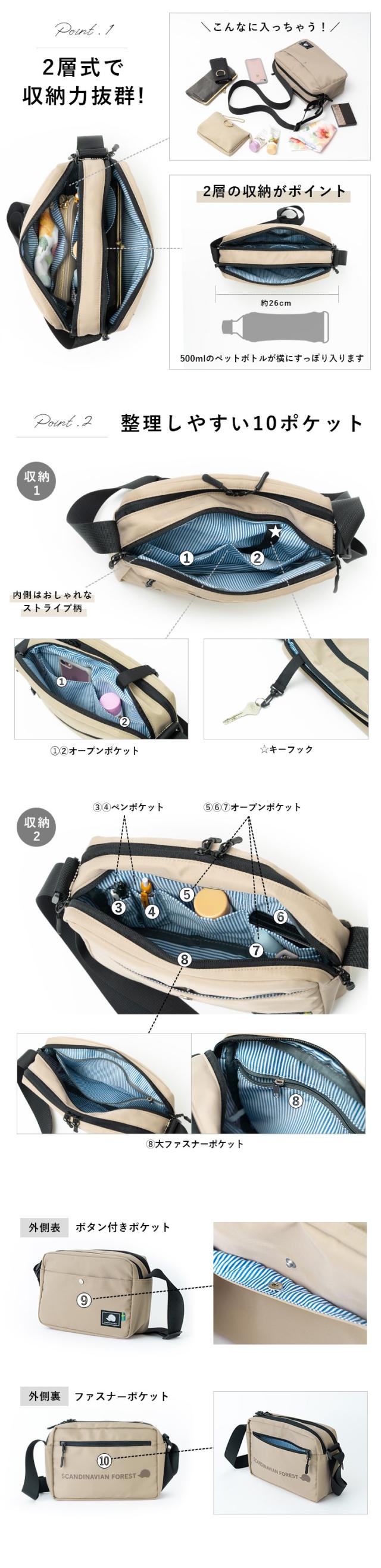 ショルダーバッグ レディース 斜め掛け スカンジナビアンフォレスト ブランド 大人 軽量 かわいい おしゃれ 小さめ 撥水 ナイロン 10ポケット 2層 仕切り ポーチ バッグインバッグ サブバッグ 旅行 通勤 通学 ファスナー付き プレゼント ギフト メール便送料無料