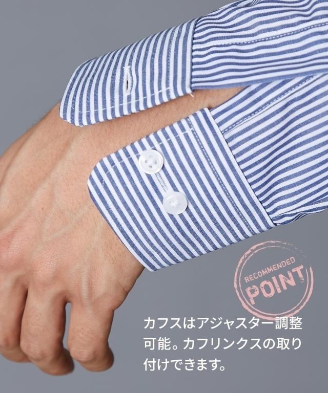 袖口のカフスは、サイズ調整が可能なダブルボタンになっており、カフリンクスの取り付けも可能です。