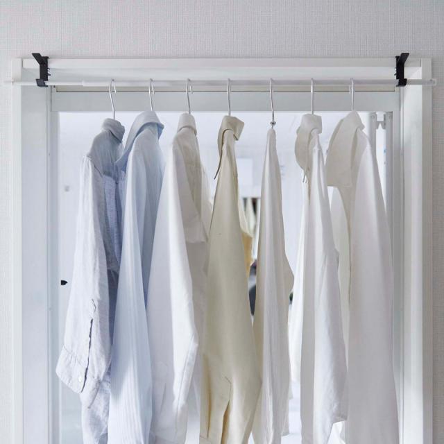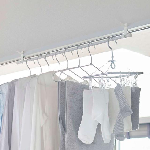 足りない物干しスペースの確保に便利な室内物干しフック2個入りです。フック2個使ってお手持ちの突っ張り棒やポールを掛けると、たくさんの衣類が干せる新たな室内干しスペースが確保出来ます。あとちょっと室内干しスペースが欲しい方や1人暮らしの方でちょっとだけ干したい方にピッタリです。