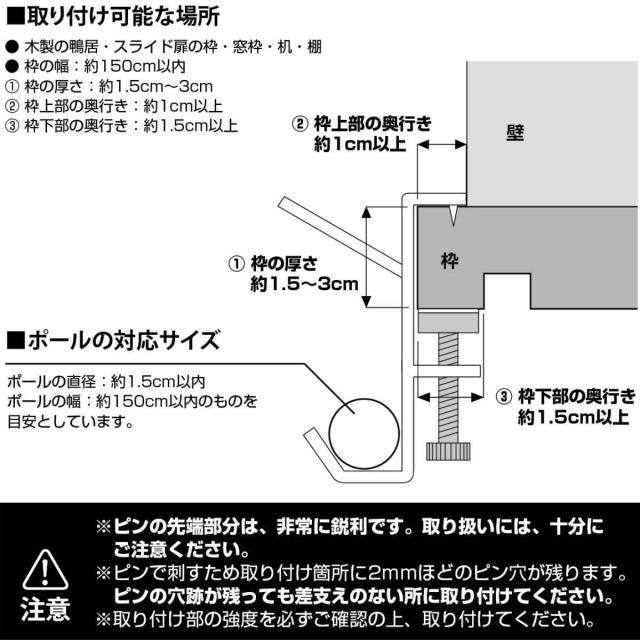 | 備考 | ※対応サイズ ポールの直径:約1.5cm以内・幅150cm以内のものを目安とする ※取り付け可能な枠 枠の幅:約150cm以下、枠の厚さ:約1.5cm〜3cm、枠上部の奥行き:約1cm以上、枠下部の奥行き:約1.5cm以上 |