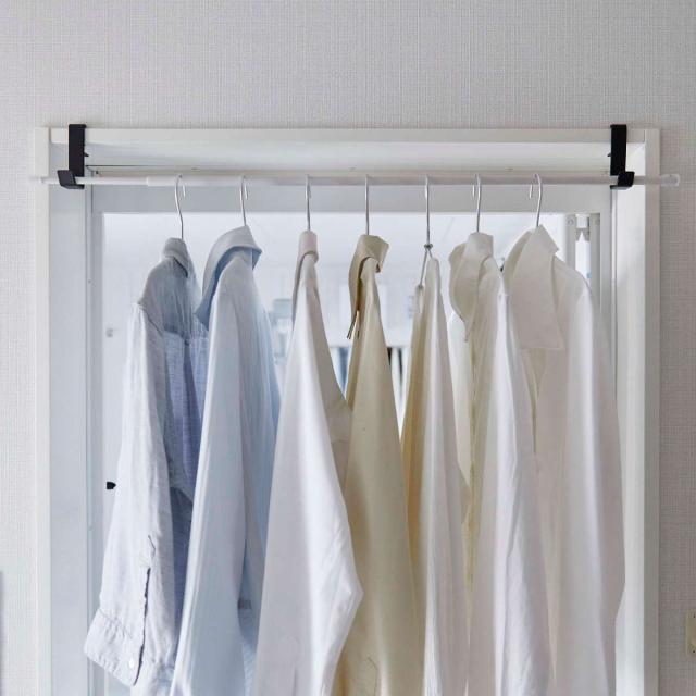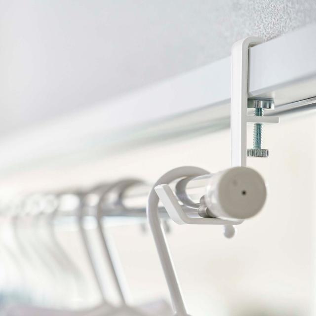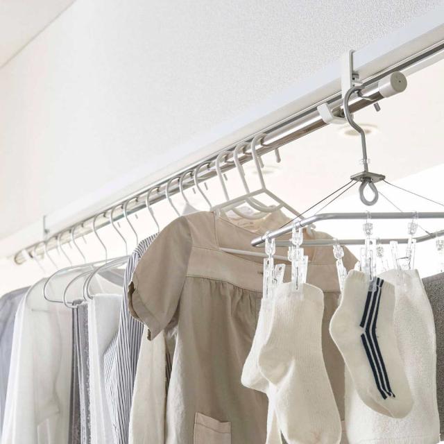 足りない物干しスペースの確保に便利な室内物干しポールホルダーです。お手持ちの突っ張り棒やポールを掛けると、たくさんの衣類が干せる新たな室内干しスペースが確保出来ます。あとちょっと室内干しスペースが欲しい方や1人暮らしの方でちょっとだけ干したい方にピッタリです。