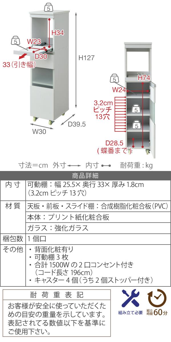 隙間収納 キッチンラック キャスター コンセント 家電ラック スリム 食器棚 家電収納 キッチン収納 隙間ラック 幅30cm スリム キッチンの隙間を有効活用!家電ラックと食器棚をこれ1台で