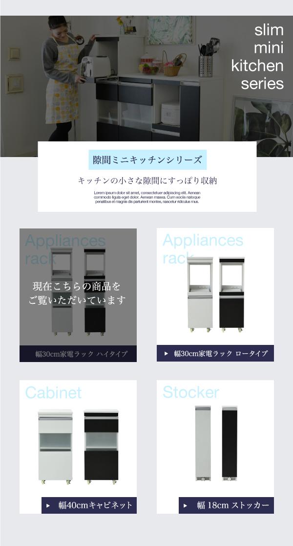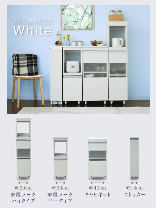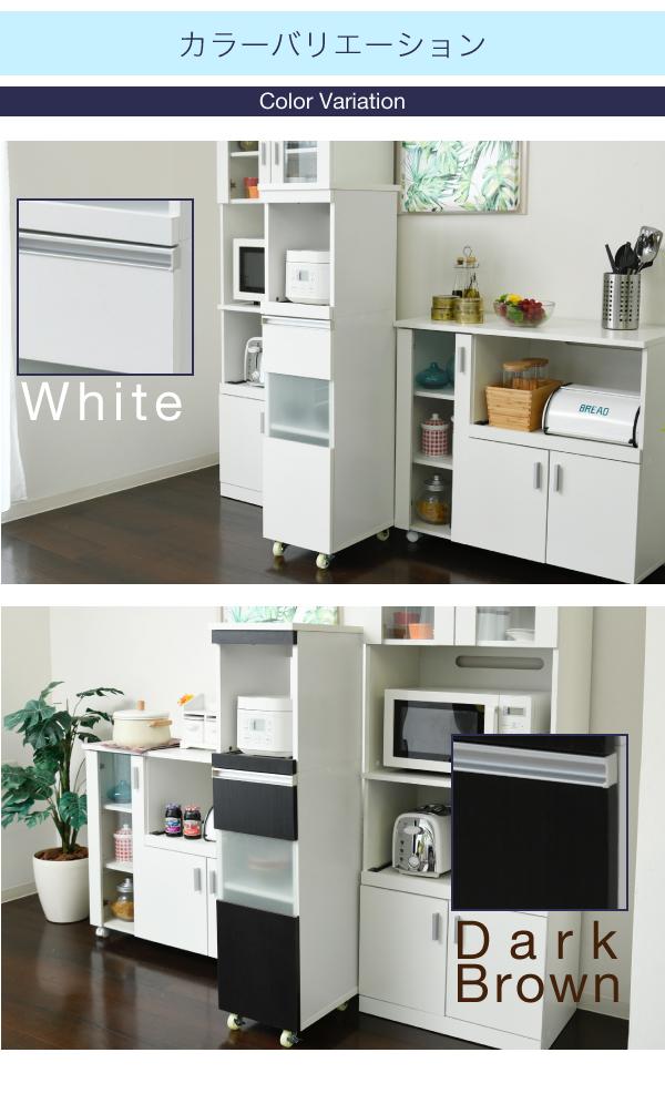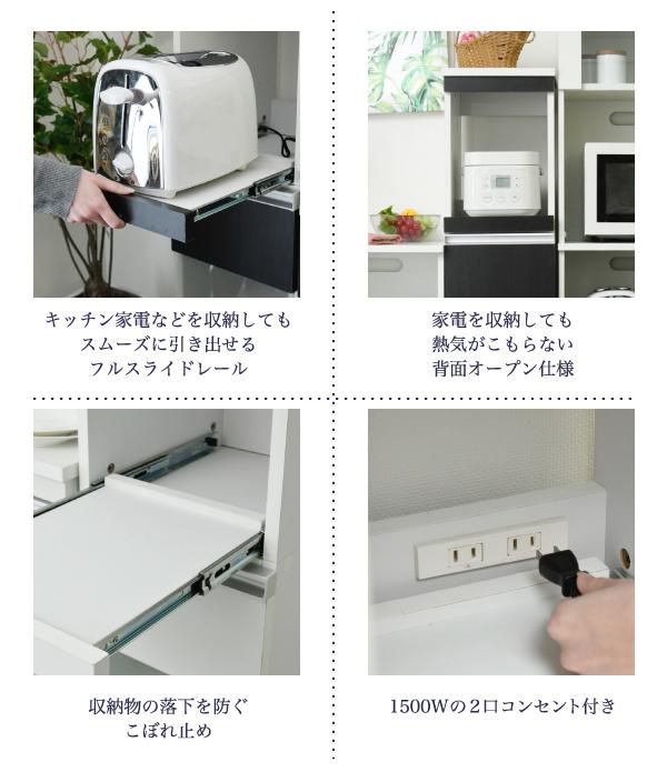 家電の収納に便利なコンセント付きスライド棚と、収納物に合わせて高さ調節ができる可動棚付きのラックをこれ1台で。ハイタイプは収納量も抜群。キッチンのちょっとした隙間に設置すれば、それまでのデッドスペースを有効活用できます。