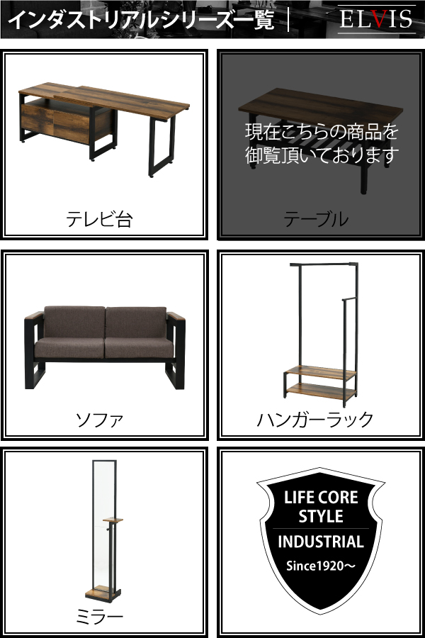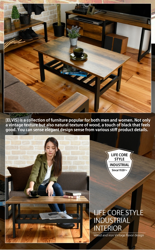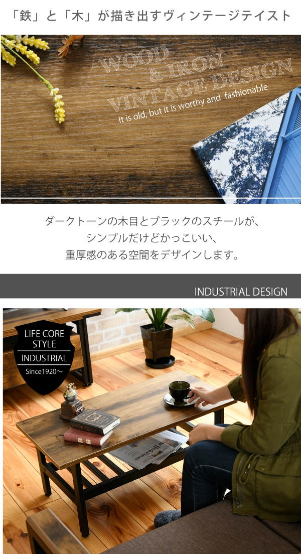 美しさと機能性を兼ね備えた、シンプルながらも深みを感じさせるデザインのリビングテーブル。抜け感のあるデザインが特徴的な収納部には、雑誌やリモコン等を収納可能。雰囲気のあるインダストリアルスタイルを気軽にお楽しみいただけます。