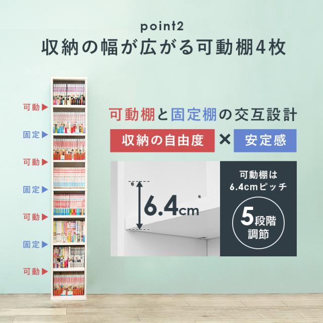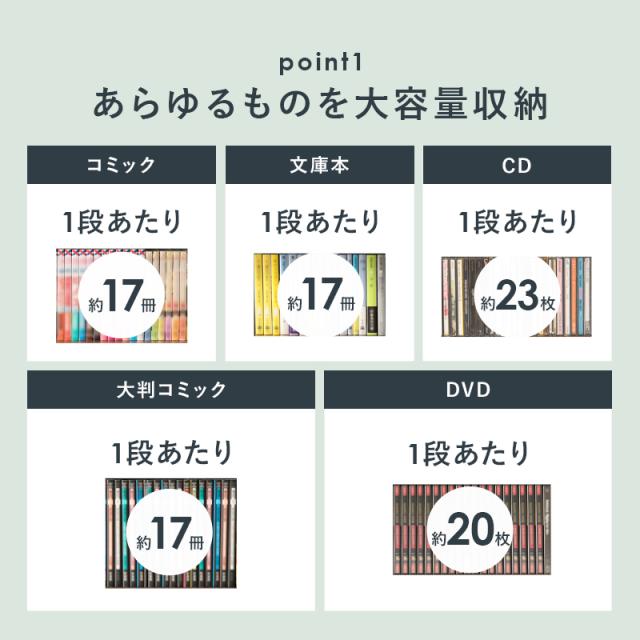 棚板の高さが調整できるので、コミック本からCD・DVDなど幅広く収納することができます。