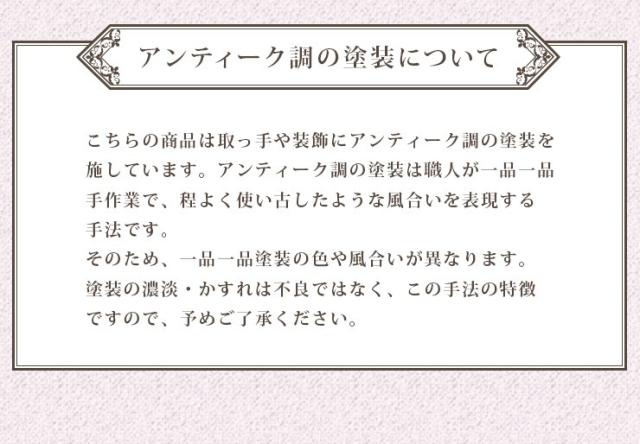 アンティーク調の塗装は職人が一品一品手作業で、程よく使い古したような風合いを表現する手法です。
