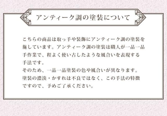 アンティーク調の塗装は職人が一品一品手作業で、程よく使い古したような風合いを表現する手法です。